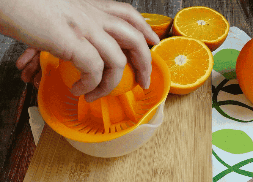 Добре миємо апельсини та вичавлюємо сік. Усього має вийде 150 мл соку.