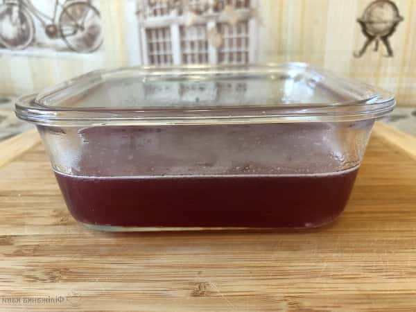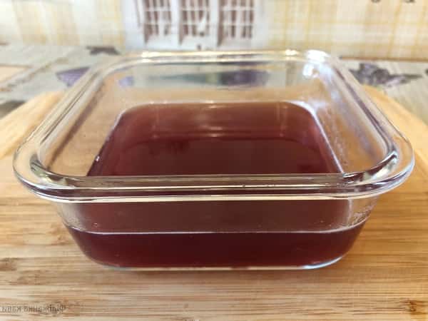 Форму, в яку будемо заливати мармелад, змащуємо невеликою кількістю олії. Переливаємо через сито желатинову рідину в форму і залишаємо охолонути до кімнатної температури.