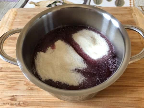 Сюди ж додаємо цукор і желатин. Цукор додавайте до смаку, у мене морс не солодкий, тому я додаю 150 г цукру. Якщо сік буде солодкий, то кількість цукру регулюйте за смаком. Якщо любите кислинку, можна додати дрібку лимонної кислоти, або лимонний сік.