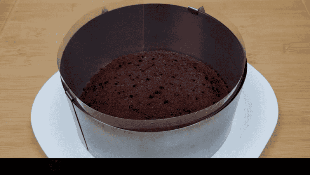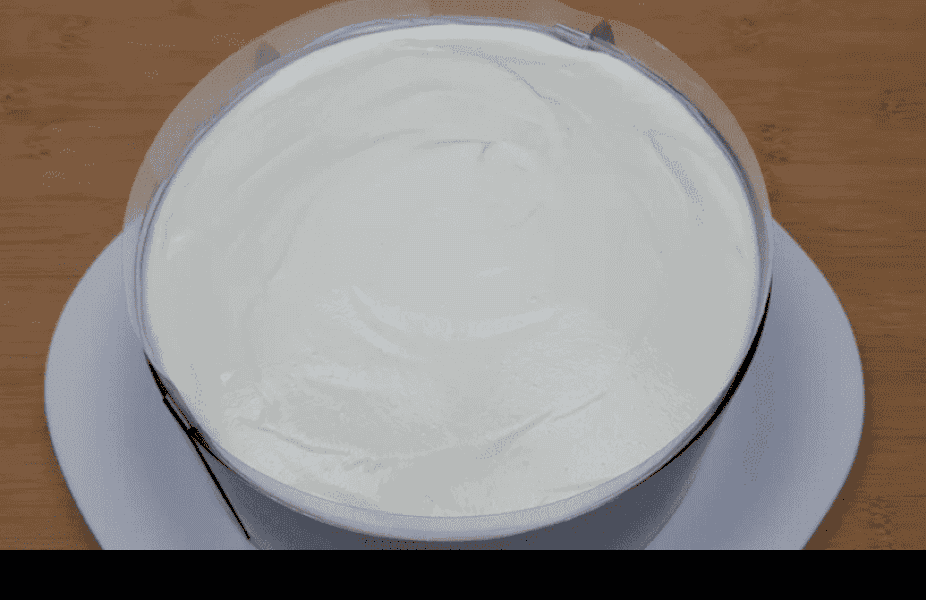 - Формуємо торт. Викладаємо перший корж на тарілку, встановлюємо кільце і ацетатну плівку. Ділимо візуально крем на 3 частини та викладаємо на корж 1/3 частину крему. Крем рівномірно розрівнюємо.