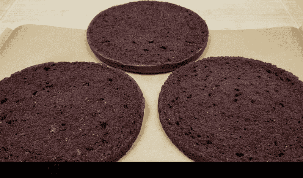 - У остиглого бісквіту зрізаємо верхівку. Зрізана верхівка нам знадобиться пізніше, ми нею прикрасимо торт.