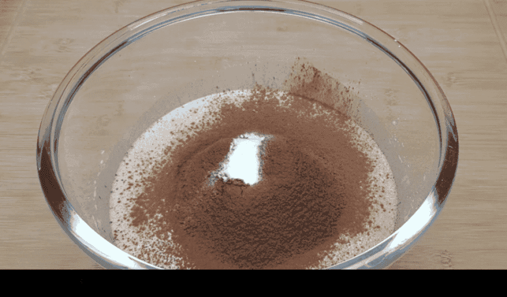 - Просіюючи додаємо – 1 склянка пшеничного борошна, 3 ст. ложки без верху какао, 1 ч. ложку соди.