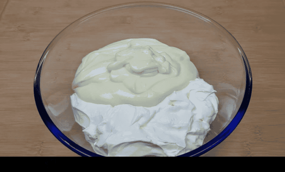 - Крем стане повітряним і збільшиться приблизно в 2 рази. Відкладаємо 2 повні ст. ложки крему. Цим кремом в кінці обмажемо бік торта, а поки що прибираємо крем в холодильник.