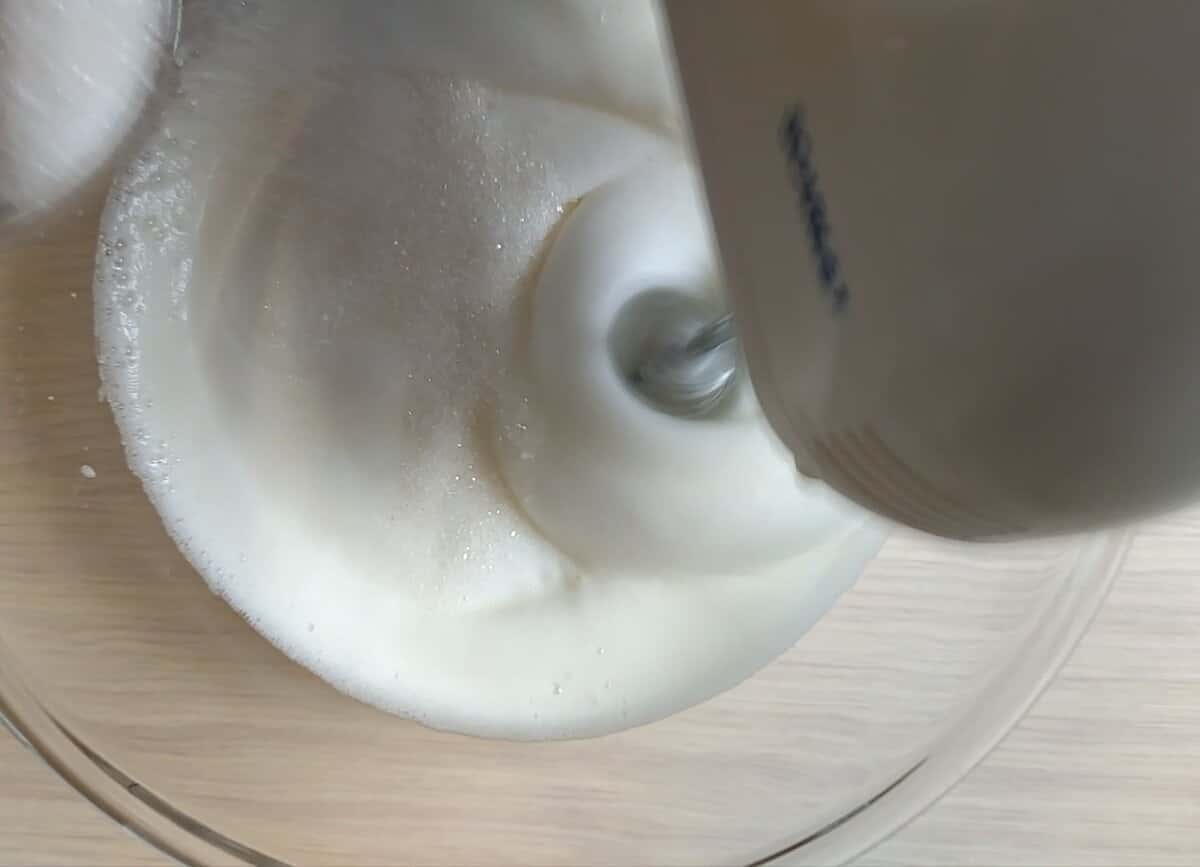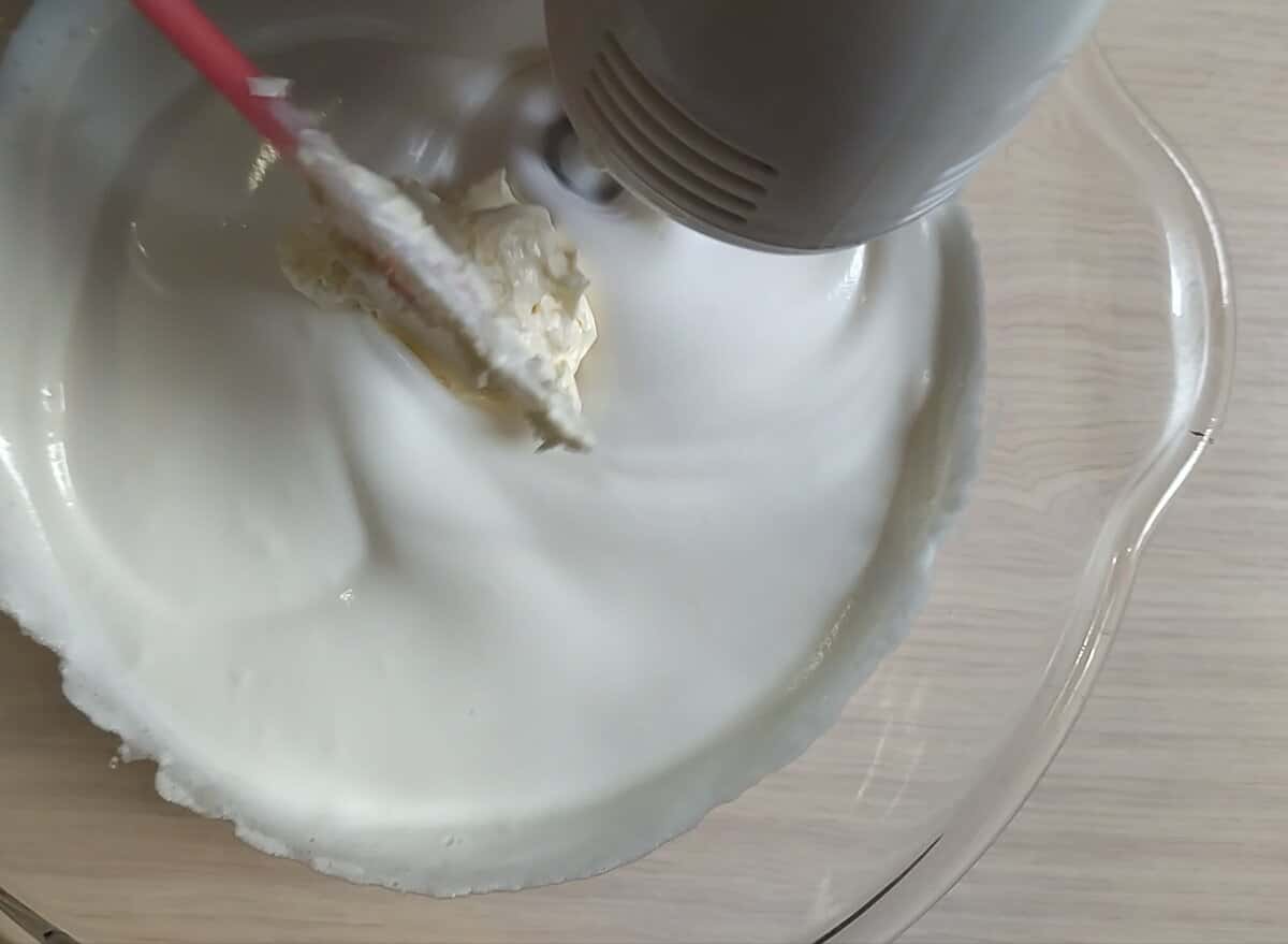 Білки збиваю на високій швидкості, до середніх піків. Не припиняючи збивати додаю лимонну кислоту і поступово засипаю 5 ст. л. цукру і ванільний цукор.