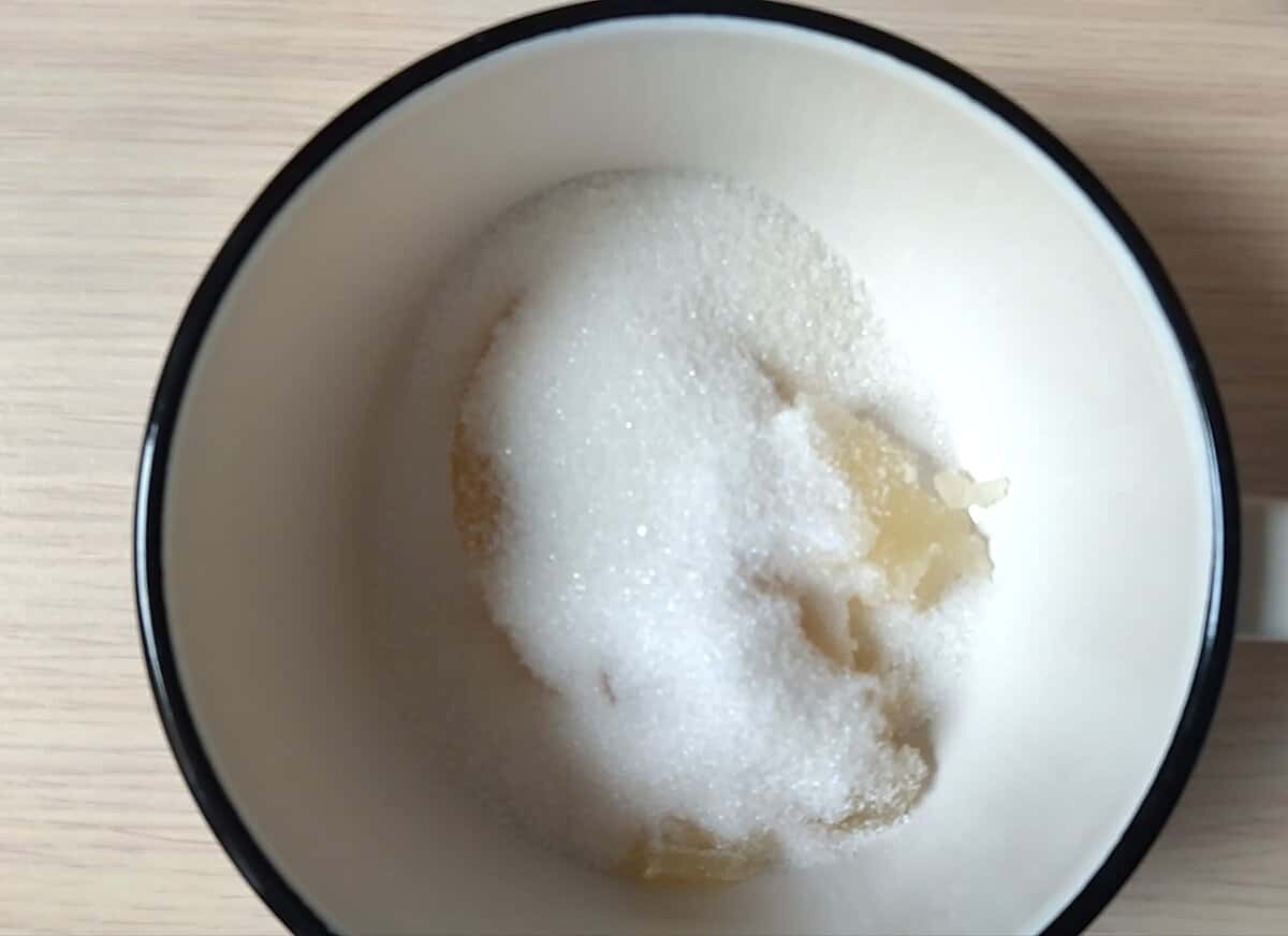 Намочений разбухлий желатин перекладаю в сотейник, додаю 5 ст. л. цукру.