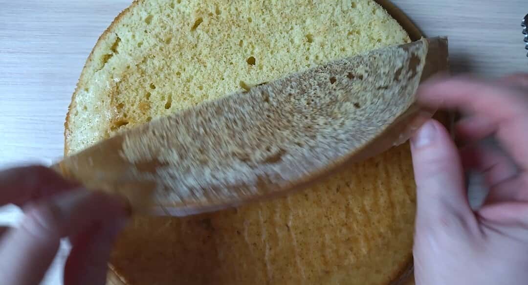 Ножем розрізаю корж навпіл.