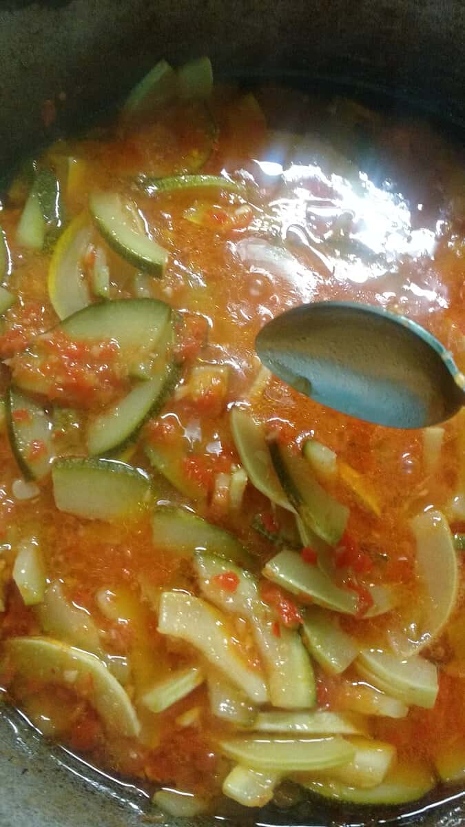 Далі скласти кабачки в каструлю, залити сумішшю з помідорів, перцю, часнику і хрону. Додати олію, цукор, сіль і оцет.