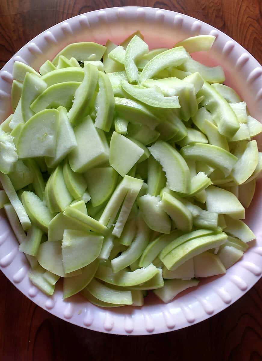 Кабачки очистити від насіння і нарізати спочатку кільцями, а потім кільця розрізати навпіл ( в принципі, можна різати так, як вам подобається ). Якщо кабачки молоді, то шкурку зрізати не потрібно.
