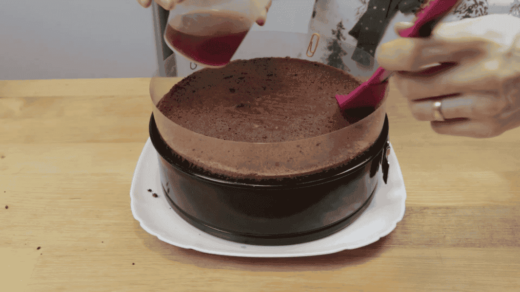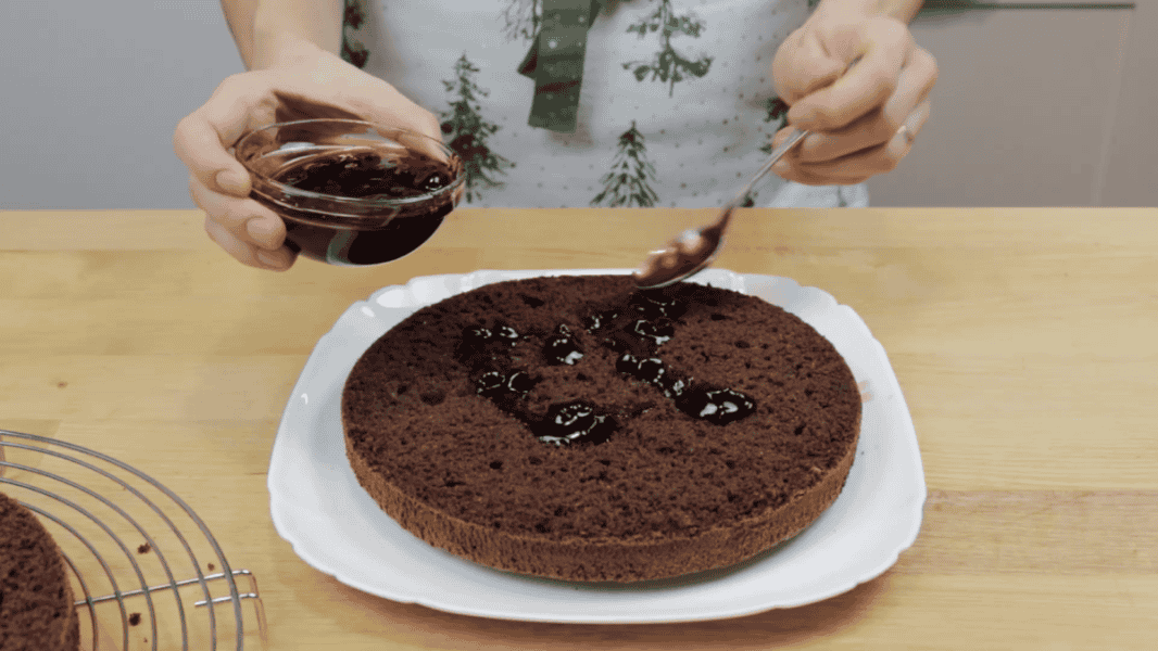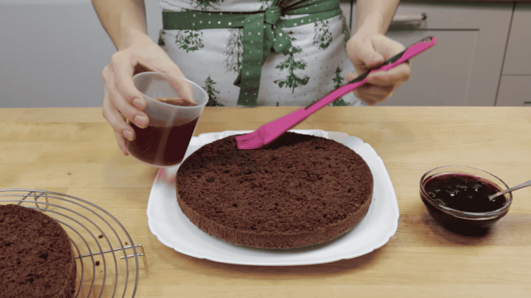 На тарілку кладу один корж, я взяла верхній, тому торт виходить ідеально рівним. Просочую його, у мене вишневий компот, можна чай, каву або за смаком. 150 мл просочення на два коржі, на перший – половина.