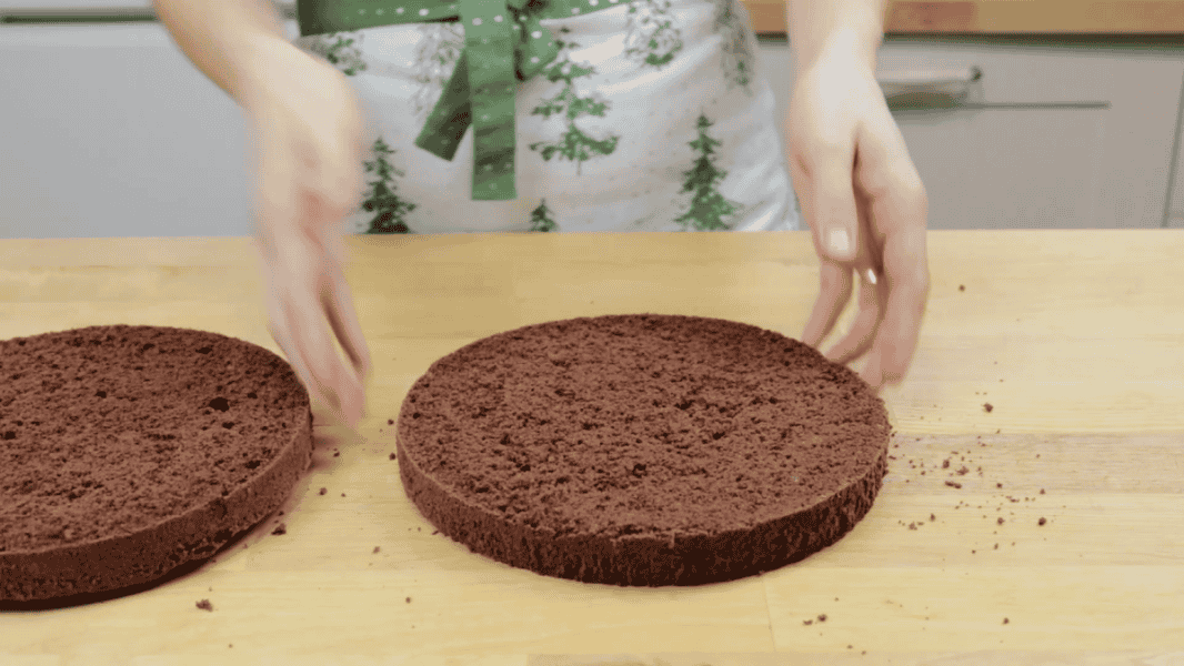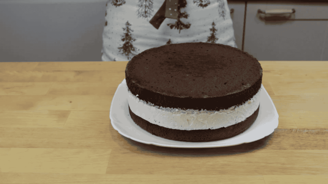 Готовий бісквіт розрізаю на два коржі.