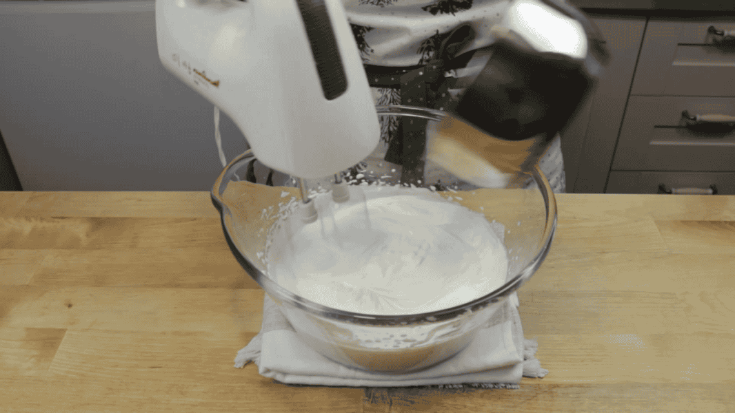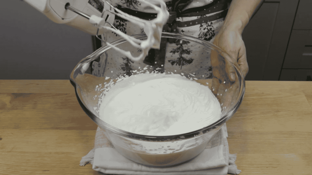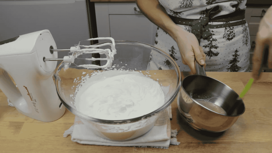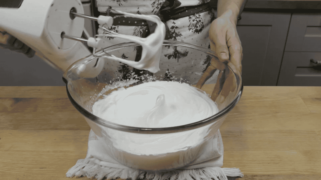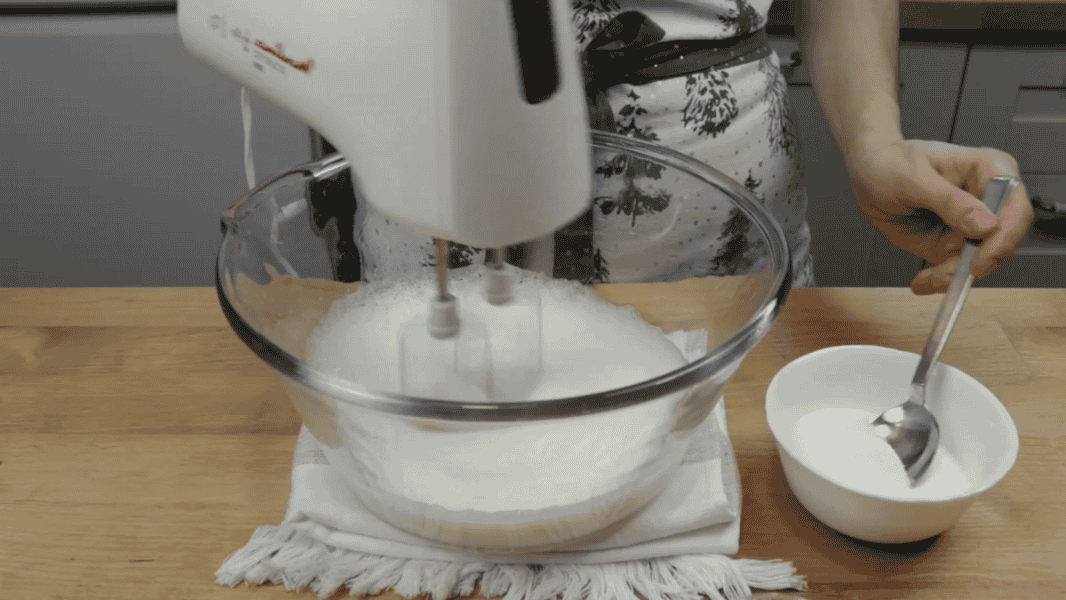 І збиваю до стійких піків. Дуже важливо цукор всипати невеликими порціями. Наприкінці ванільний цукор.