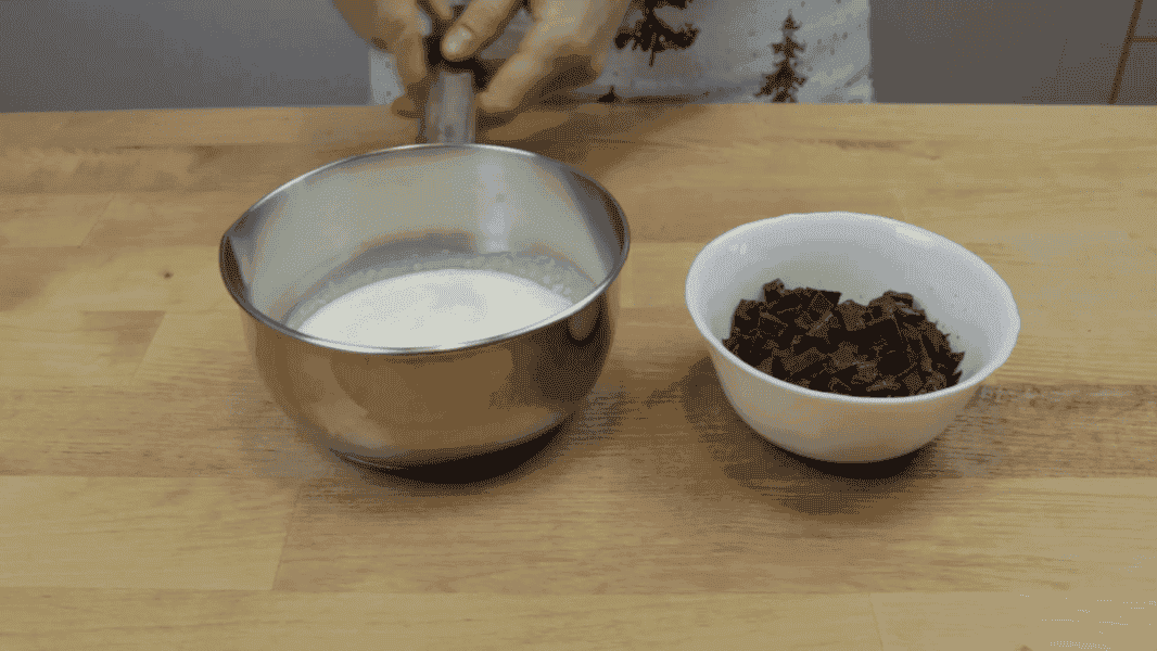 Глазур. Нагріваю вершки, доводжу до кипіння, але не кип’ячу. Всипаю в вершки шоколад і вимішую до гладкої глазурі.