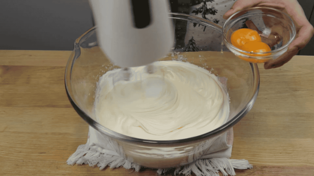 Тепер на мінімальній швидкості підмішую жовтки по одному.