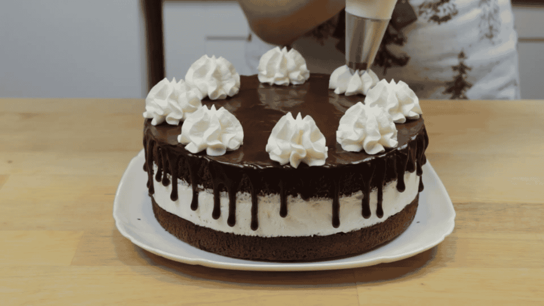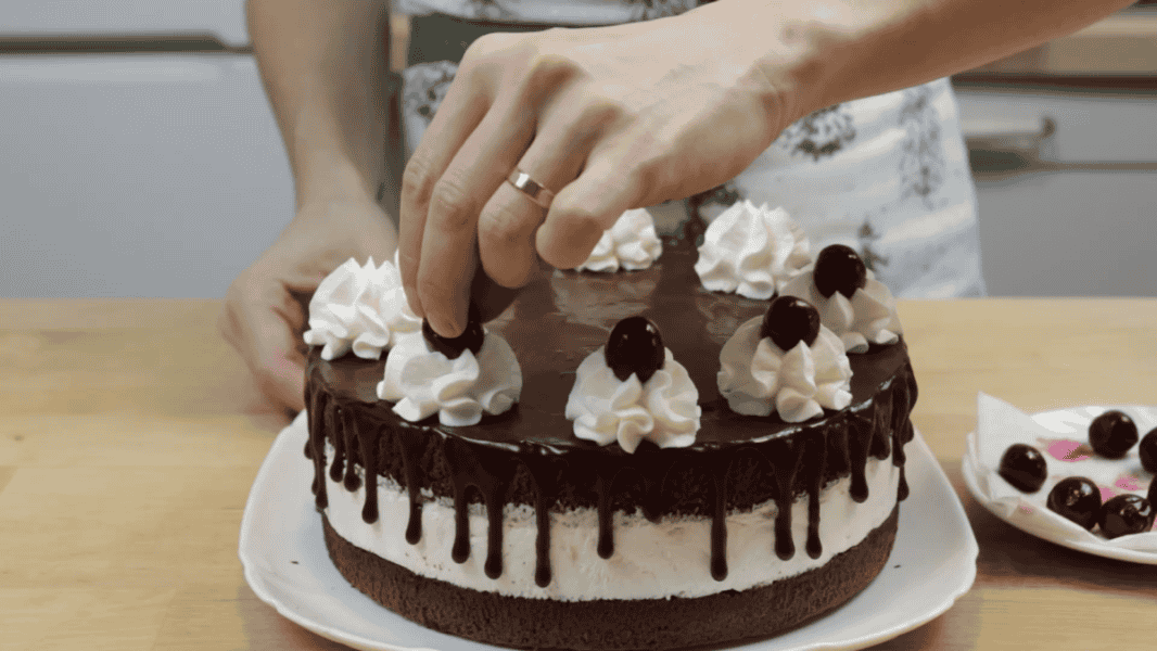 Торт готовий. Можна залишити його в такому вигляді, я зробила прикрасу з вершків та вишні. Збила 100 г вершків та 1 ч. л. цукрової пудри. Відсадила зверху за допомогою кондитерського мішка та насадки закрита зірка.