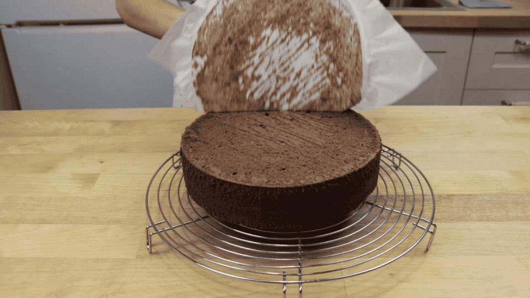 Перевертаю на решітку та залишаю повністю охолонути. Охолоджений бісквіт по краю підрізаю тонким ножем і витягаю його з форми. Бісквіт виходить заввишки 4 см.