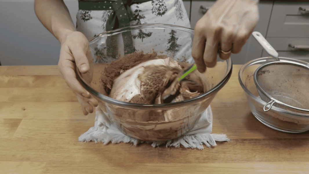 Какао – порошок змішую з борошном і в два прийоми просіюю в миску. Акуратно перемішую лопаткою, наче складаючи тісто.
