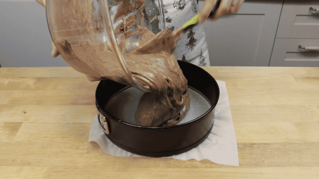 Готове бісквітне тісто перекладаю у форму діаметром 21 см. Дно форми попередньо потрібно застелити пергаментним папером. Бортики змащувати нічим не можна, для бісквіту це дуже важливо.