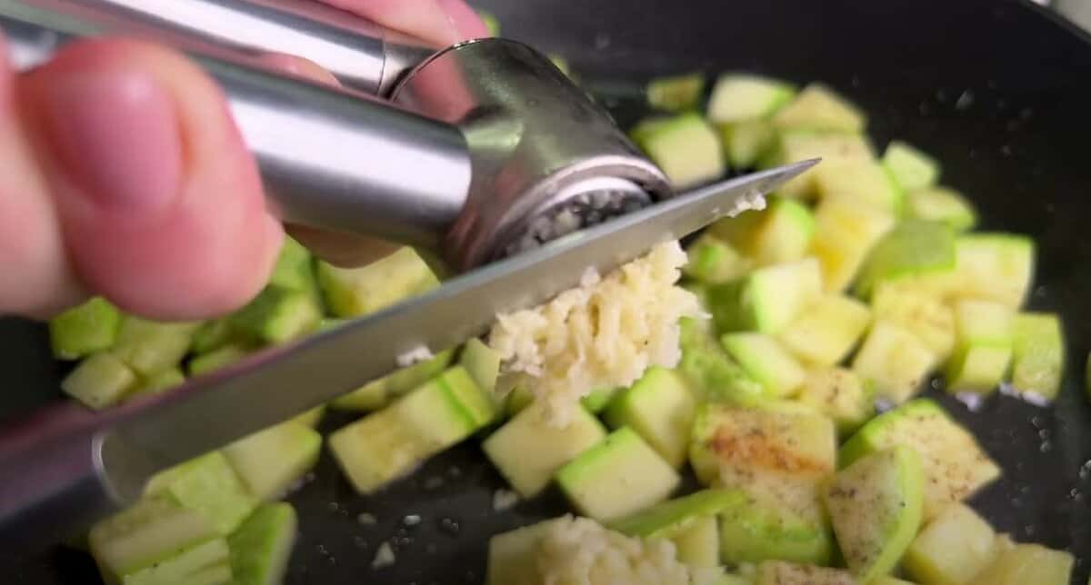 Додамо сіль і перець до кабачків, а також видавимо часник. Добре все перемішаємо.