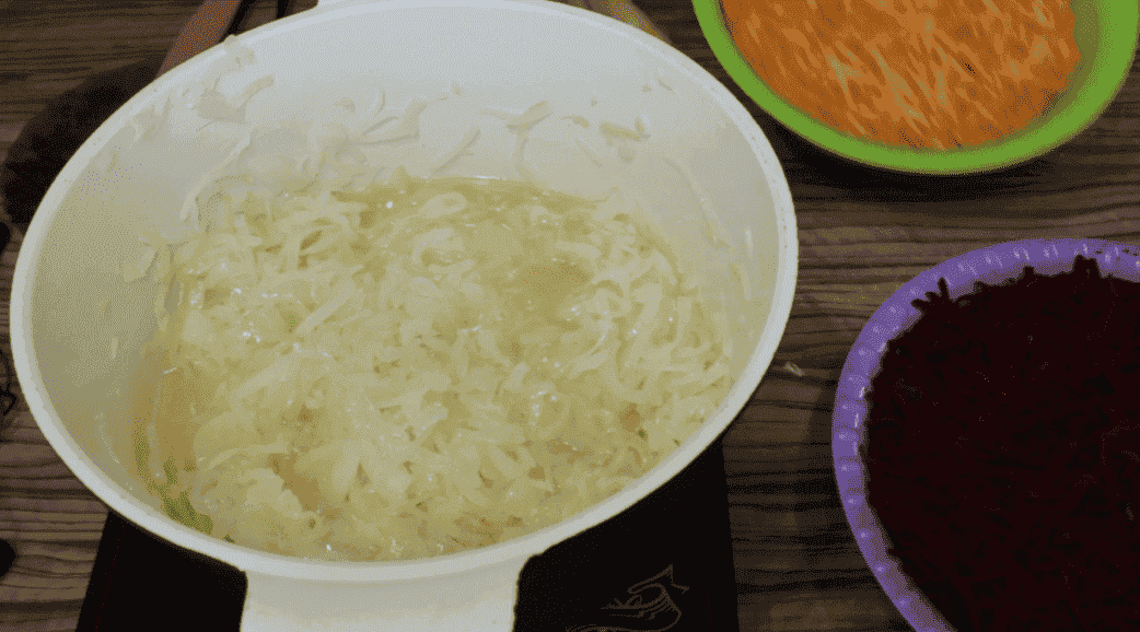 Наступною обсмажуємо 1 кг моркви, через хвилин 8 олія забарвиться в гарний помаранчевий колір, морква обм’якне, можна додавати 1,5 кг буряків.