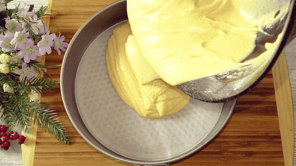 Переливаю тісто в форму, у мене роз’ємна 26 см, форму можна брати діаметром 24 см, дно застилаю папером для випічки і нічим додатково не змащую, бортики форми теж не змащую.