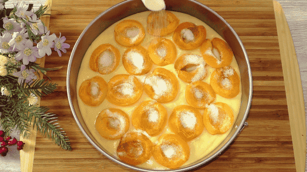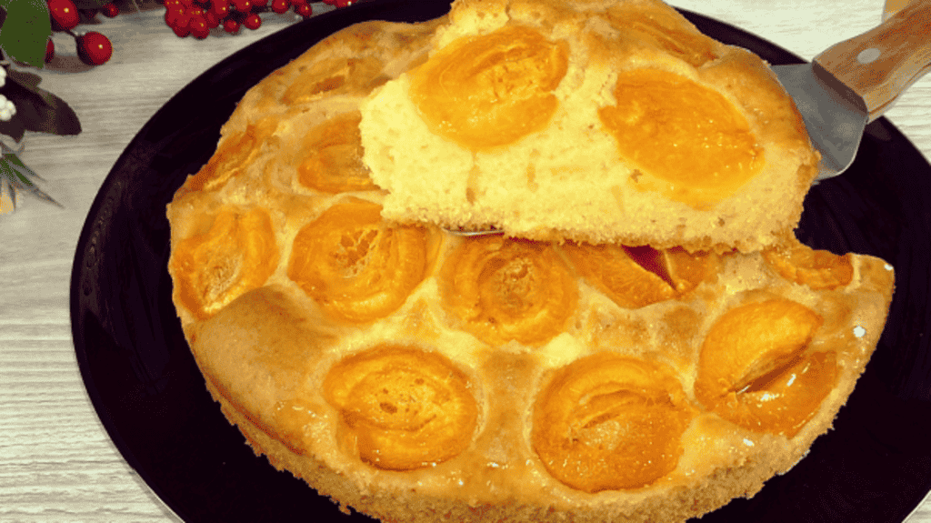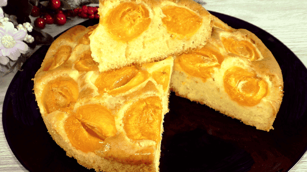 Тісто м’яке, солодке, присутня кислинка абрикоса. Дуже простий в приготуванні пиріг, а виходить завжди смачно.