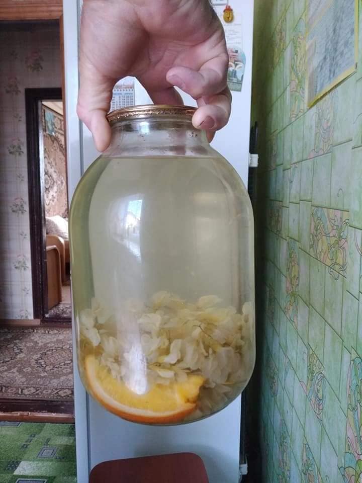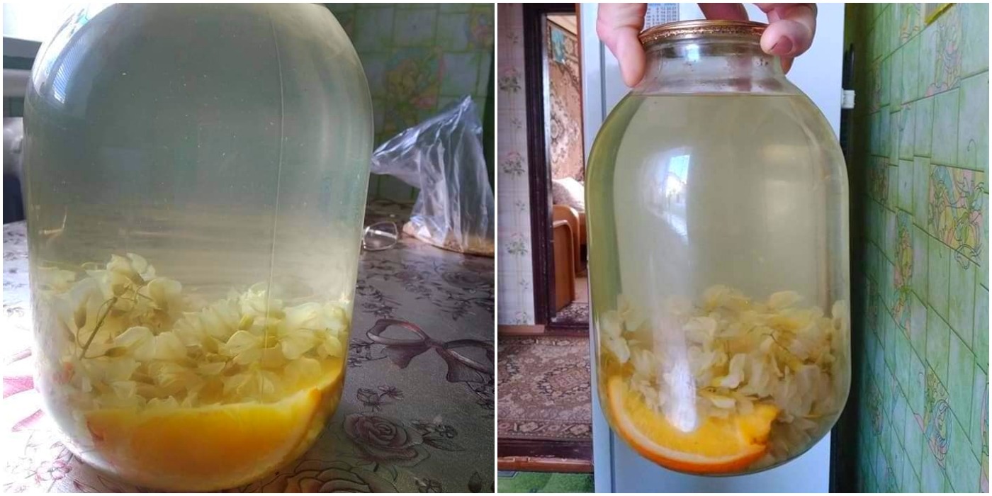 В 3 літрову банку вкинути 5-6 китиць цвіту акації , четверту частину апельсина , порізати на скибочки, всипати 1 стакан (200) цукру і 1 ч л лимонної кислоти , залити крутим кип’ятком , закатати кришкою і добре закутати.