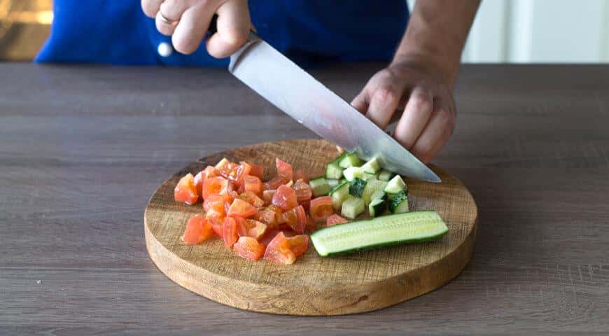 Огірки і помідори для салату вимийте, обсушіть. У огірків зріжте кінчики, плоди наріжте маленькими кубиками. Помідори розріжте на половинки і видаліть підстави плодоніжок. М’якоть наріжте маленькими кубиками.