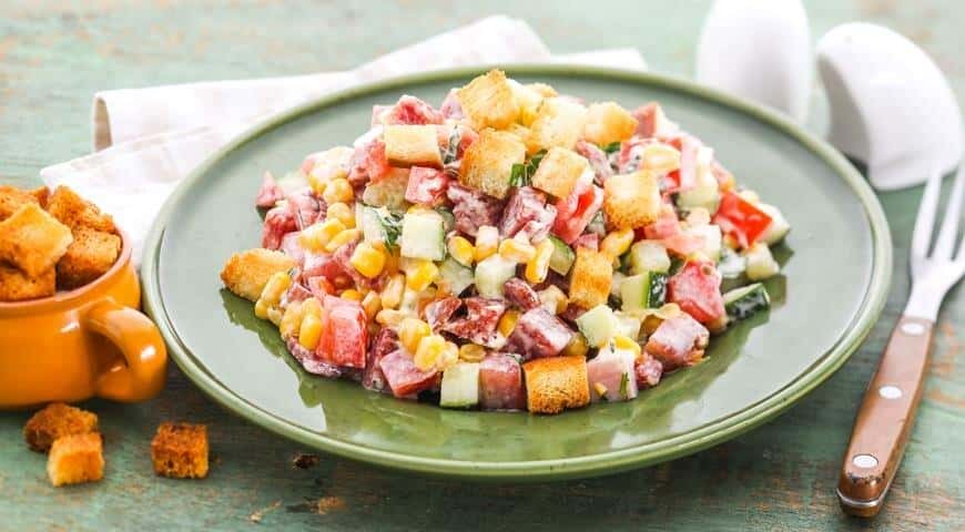 Приготуємо сьогодні смачний та швидкий салат з сухариками, ковбасою і кукурудзою.
