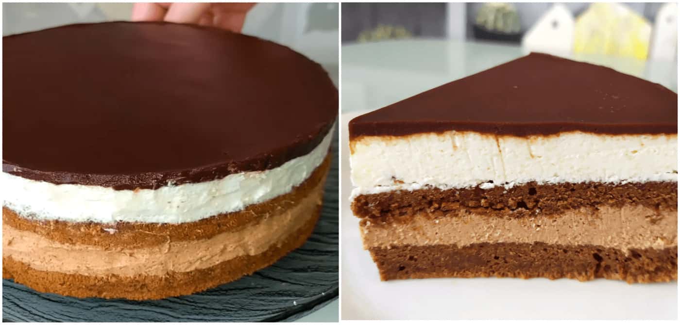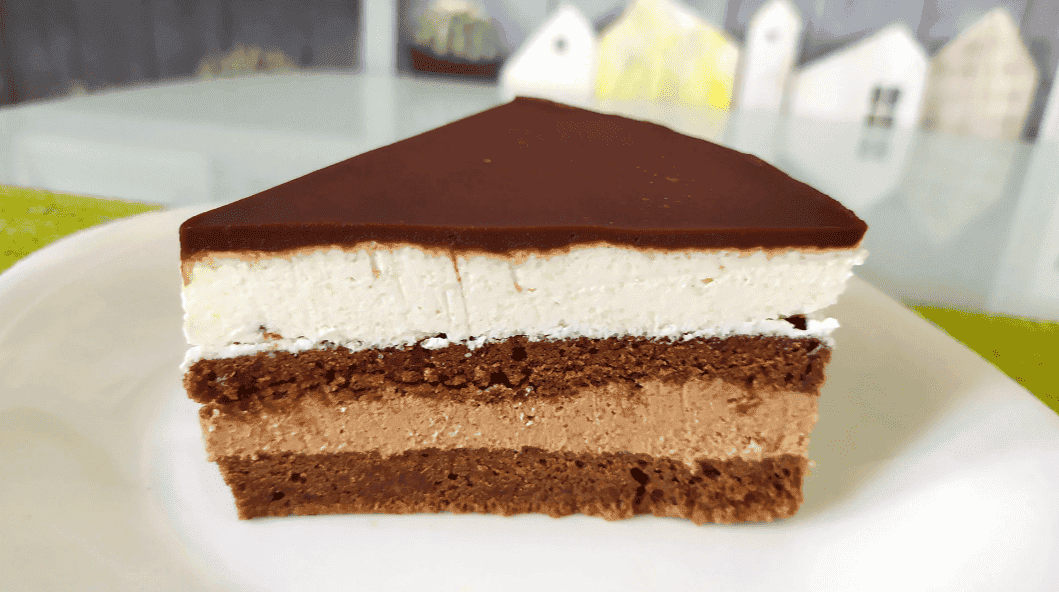 Помістити один бісквіт у роз’ємне кільце або форму (за бажанням просочити цукровим сиропом), викласти шоколадний крем, накрити другим коржем, викласти білий крем, розрівняти лопаткою і прибрати в холодильник на 2-3 години;