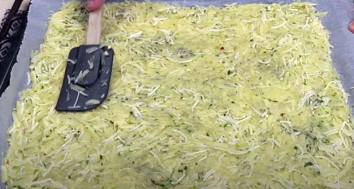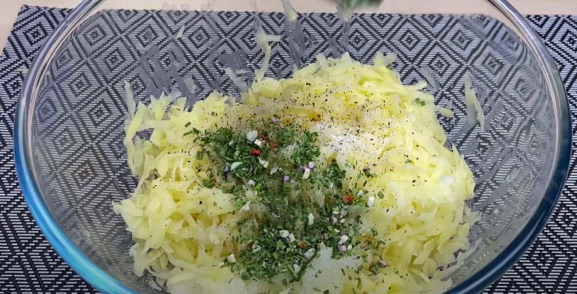 Цибулину теж натираємо на терці і додаємо до картоплі. Солимо, перчимо, приправи до смаку.
