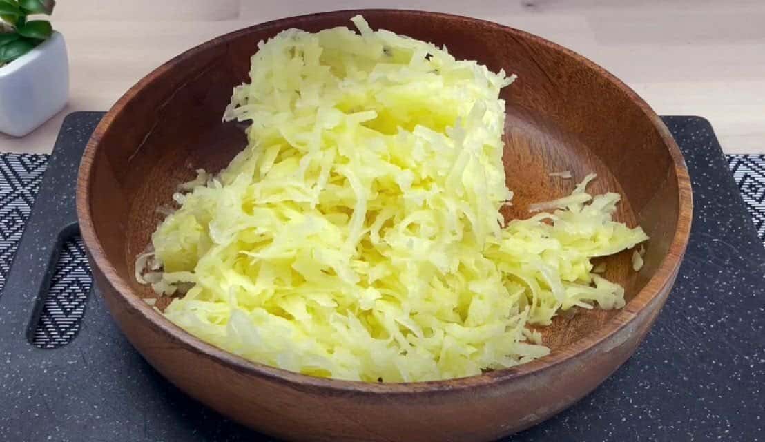 Сиру картоплю натираємо на терці, віджимаємо з неї зайвий сік.