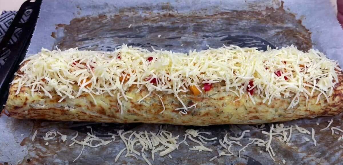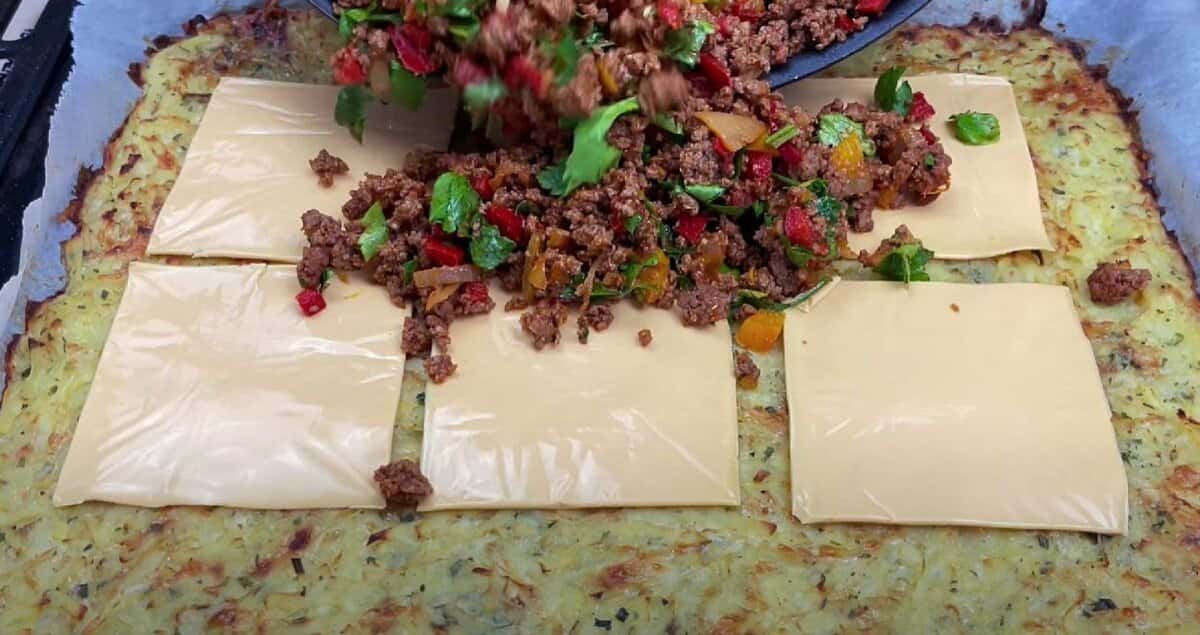 На запечений картопляний пласт викладемо плавлений сир, потім м’ясну начинку.