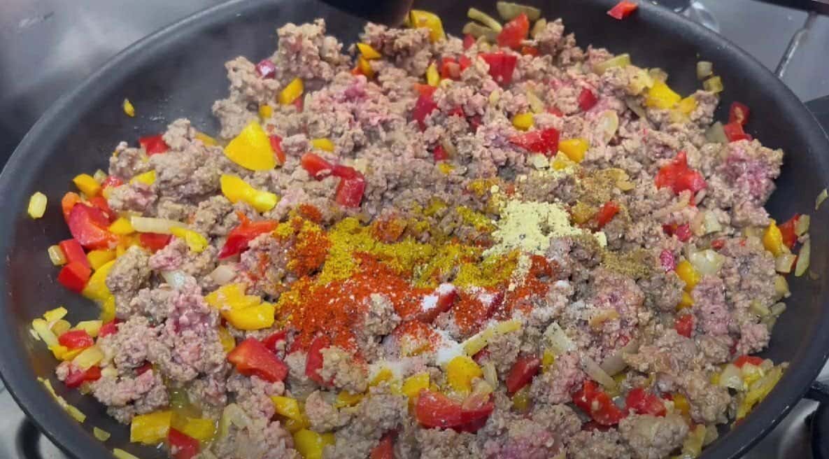 Для начинки обсмажити цибулину, часник і солодкий перець. Додамо фарш і приправи. Злегка обсмажити. Додамо трохи води і томатну пасту. Тушкуємо під кришкою 10-15 хвилин