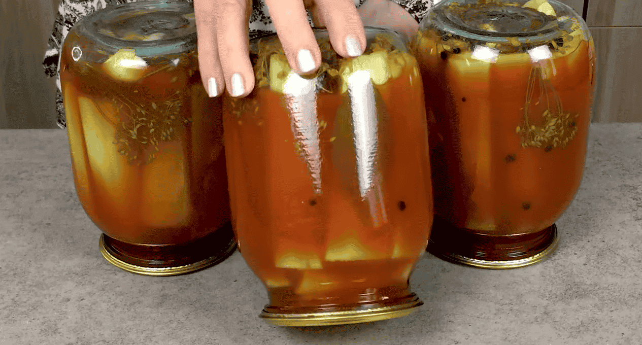 Кабачки та томатний маринад виходять в міру гострими та дуже смачними. Такі банки чудово зберігаються у шафі при кімнатній температурі.