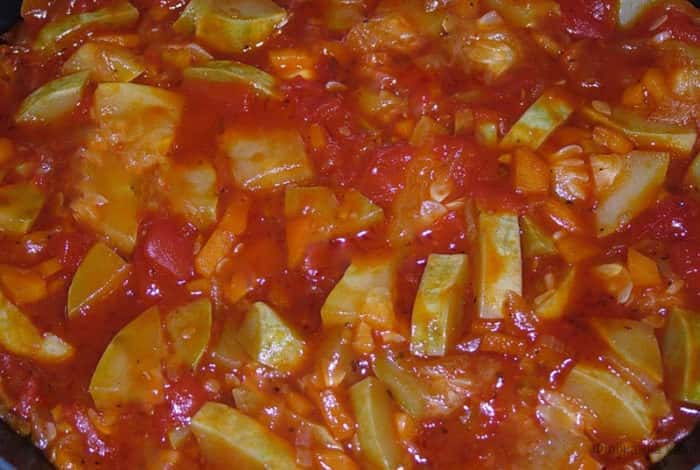 Потім, до помідорів додаємо кабачок, нарізану цибулю, моркву, подрібнену на тертці або порізану тонкими скибочками, сіль і цукор за смаком і 150 мл. води. Воду додають ті, хто любить більш рідкі заготовки. Без води теж відмінно вийде, тому що, кабачок з помідорами віддадуть багато рідини.