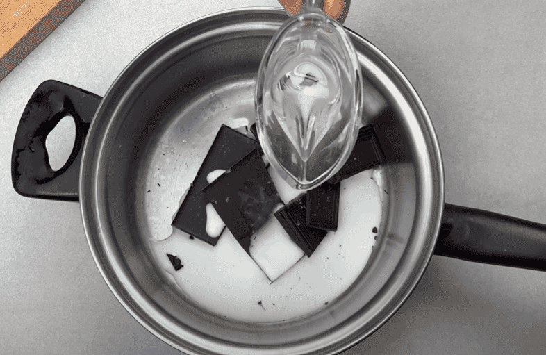 Плитку шоколаду (80 г) розламуємо на шматочки і викладаємо в каструлю.
