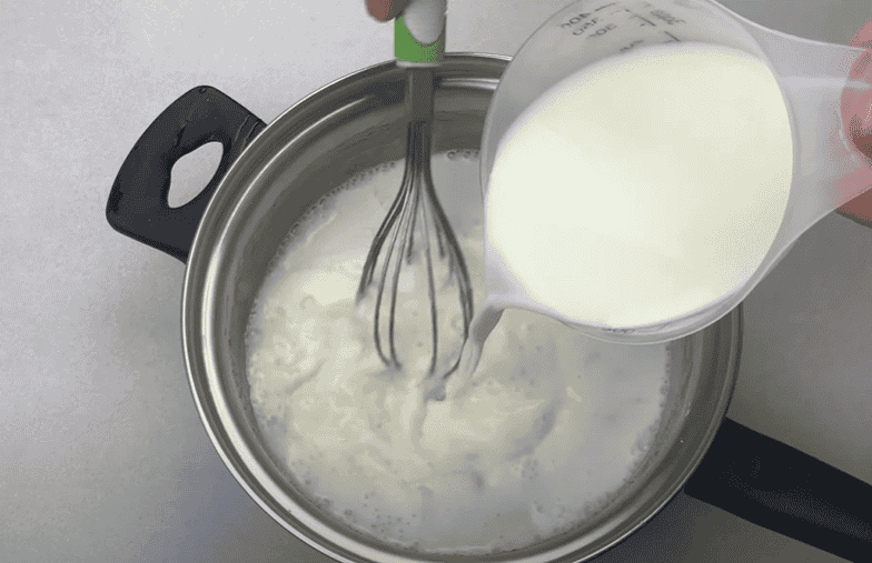 Частинами вливаємо молоко, постійно помішуючи.