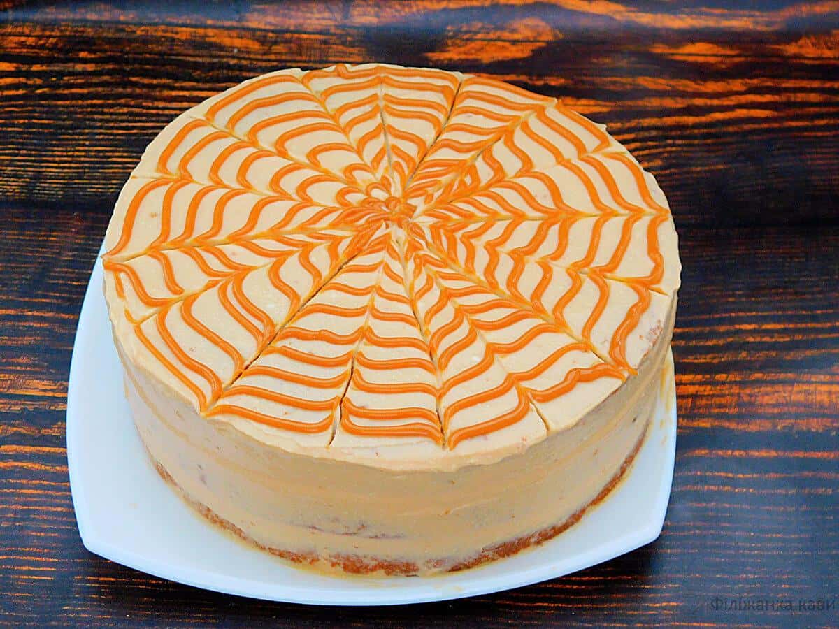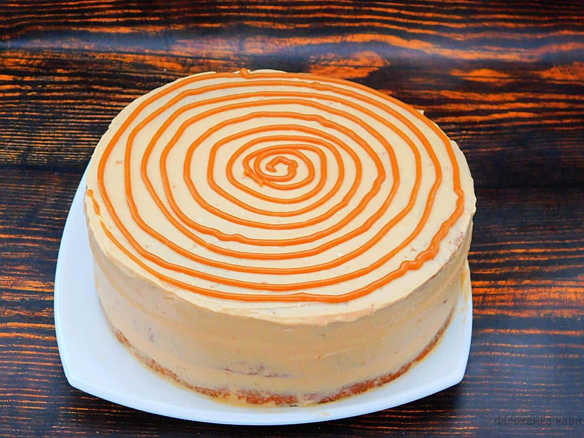 - Вирівняти торт залишеним кремом. Поклавши трохи вареної згущенки в пакетик з відрізаним куточком, намалювати на поверхні спіраль або прикрасити за бажанням.