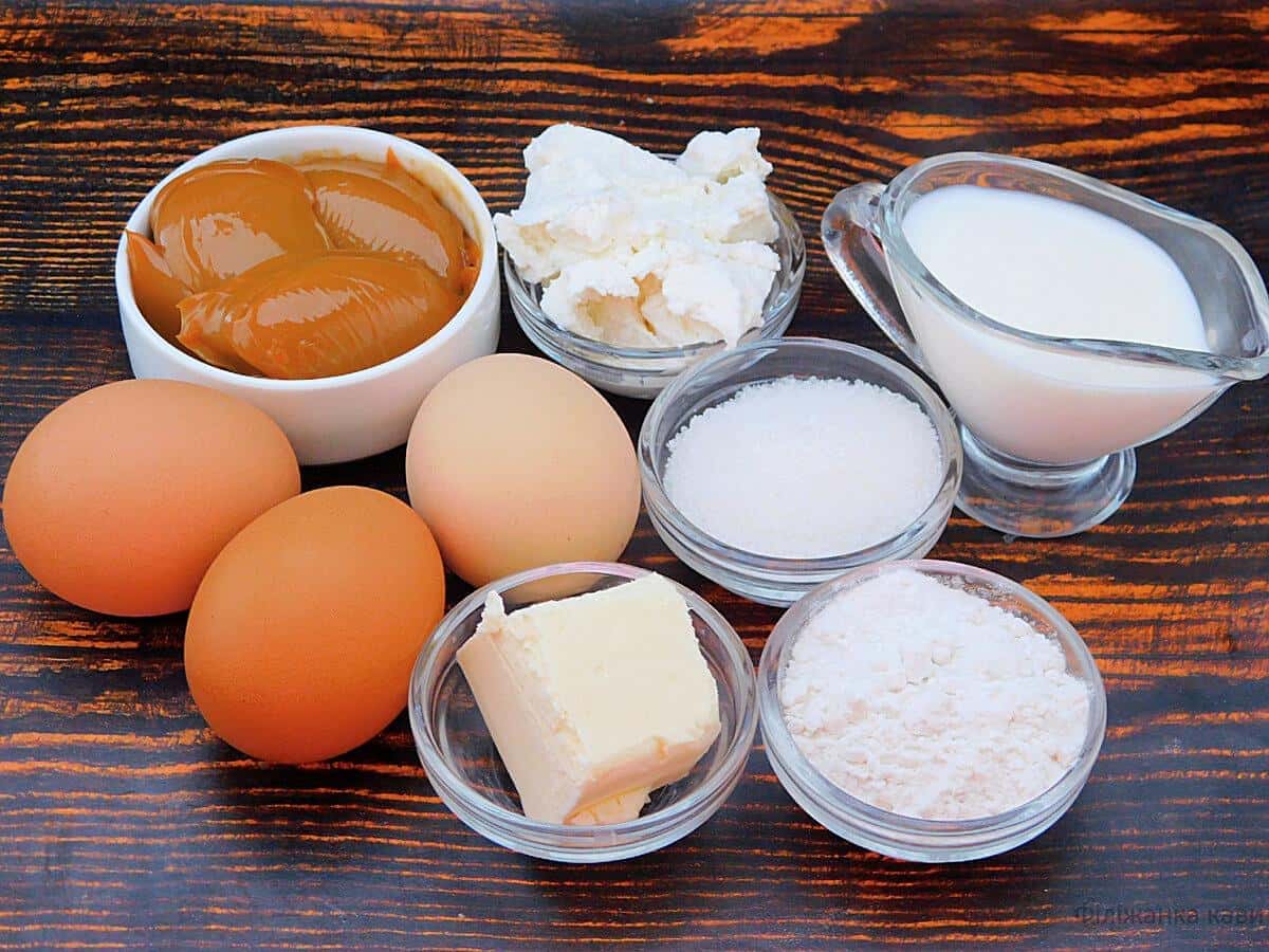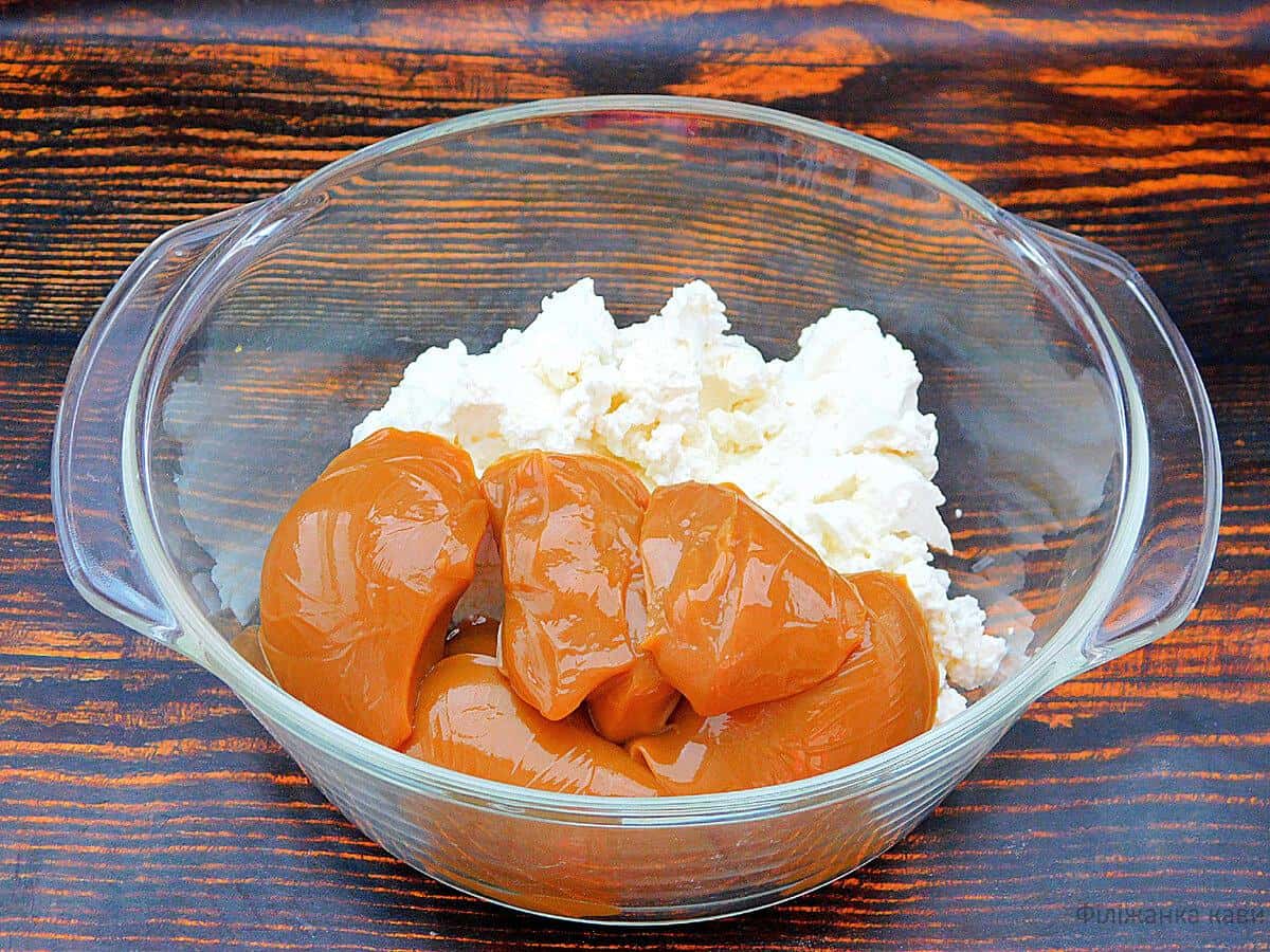 - Для крему в миску помістити варену згущенку і м’який сир (можна замінити на густу сметану).