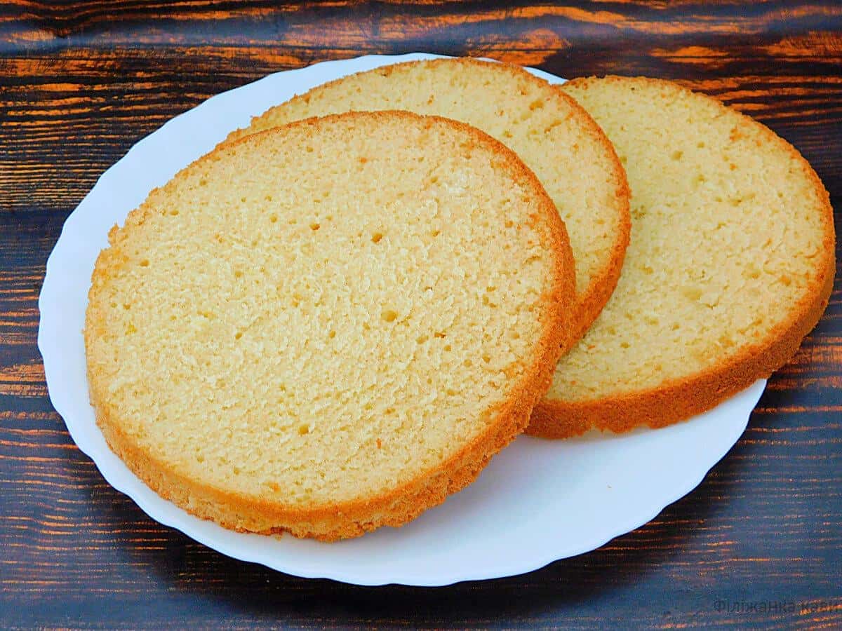 - Розрізати його на 3 однакових коржі. Трохи опуклу верхівку зрізати, підсушити на сковороді і розкрошити руками, крихти знадобляться для декору.