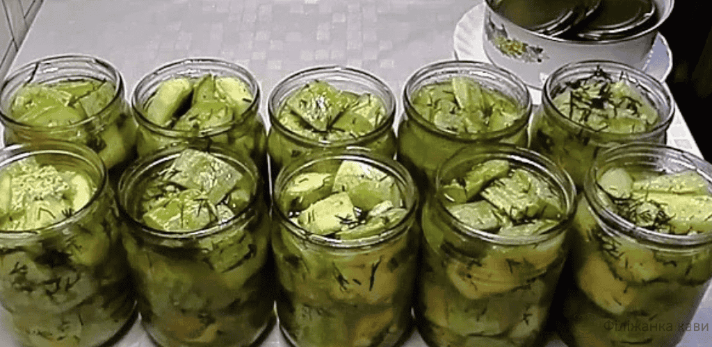 Всі банки наповнюємо кабачковими скибочками якомога щільніше, додаємо маринад – так, щоб скибочки були повністю покриті рідиною. Намагайтеся якомога щільніше укласти кабачкові шматочки – тоді рідини вистачить на всі баночки. Зверху банки накриваємо стерилізованими кришками.