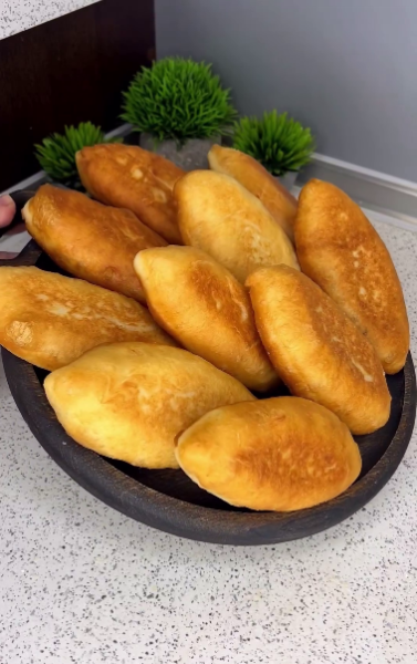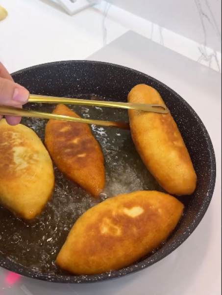 Пиріжки як тільки виклали на сковороду, хвилину готуємо і відразу перевертаємо на інший бік, готуємо до рум’яності та золотистого кольору, а потім знову повертаємо на початкову сторону і досмажуємо її. Дістаємо.