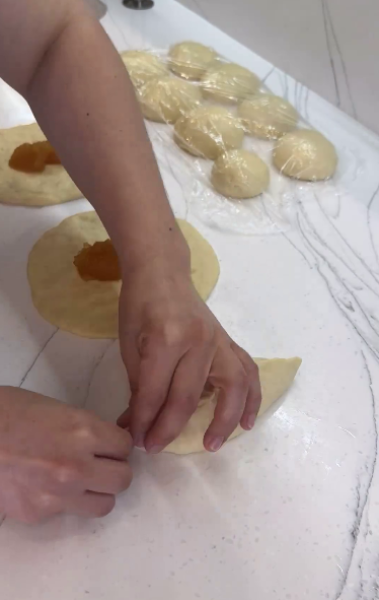 Прибираємо під плівку, якщо тісто липне змастіть поверхню і руки олією. Формуємо пиріжки