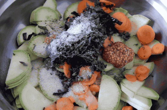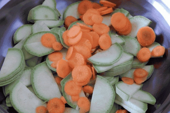 Кабачок і моркву помити, обрізати хвостики біля кабачка, моркву пошкребти ножем. Нарізаємо тонкими півкільцями кабачок, а моркву тонесенькими кільцями або на терочку. Висипаємо в одну велику ємність.