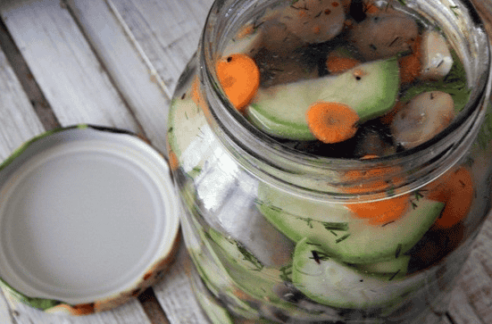 У літрову банку пересипаємо через час кабачки з грибами та розсолом.