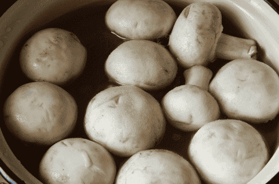 Печериці добре помити, залити водою в каструлі і додати солі, чайну ложку. Щоб у заготівлі вони були смачні, ми їх проваримо спочатку. Печериці закипіли і хвилин 15 нехай проваряться. Потім їх потрібно виловити шумівкою, дати трохи охолонути і нарізати тонкими шматочками.