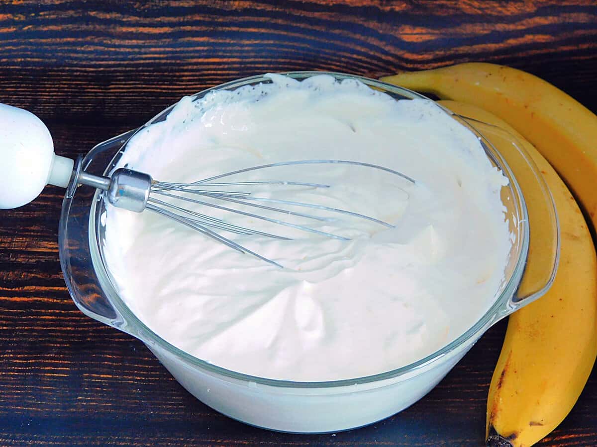 3. Для крему в миску викласти сметану і цукор. Збити міксером, поки маса не збільшиться в обсязі. На поверхні повинні залишатися сліди від вінчиків.