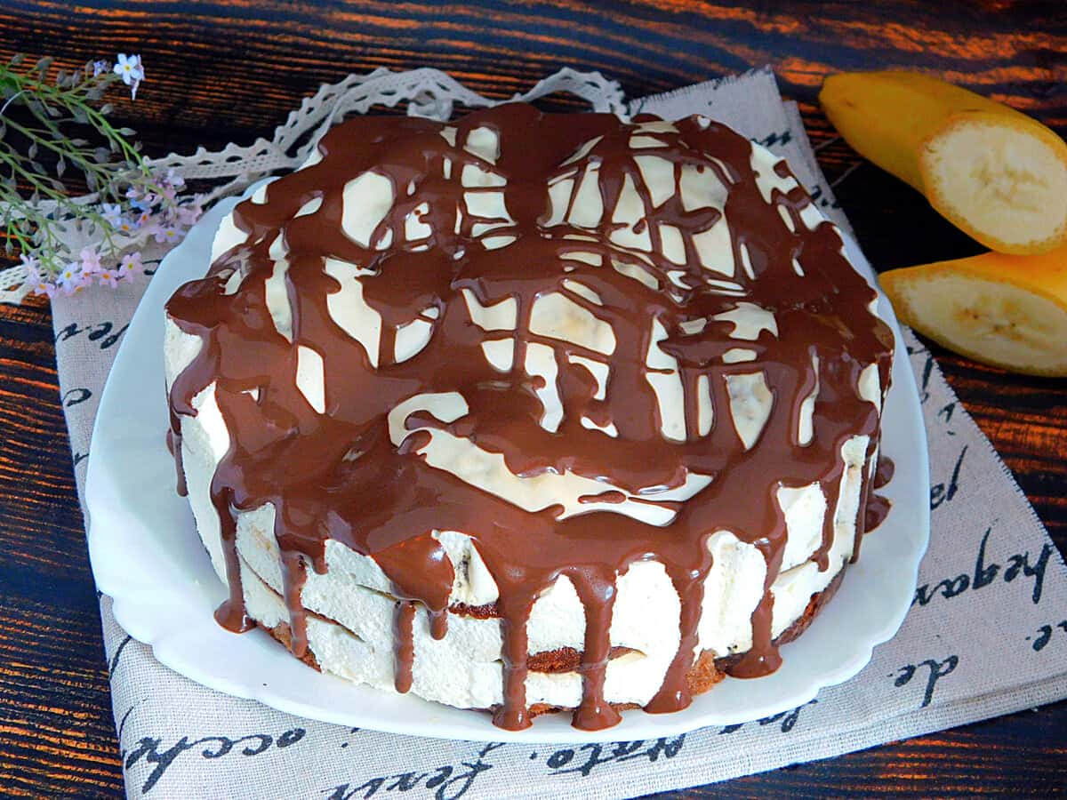 7. Затягнути торт харчовою плівкою і поставити в холодильник на 6-8 годин. Перед подачею прибрати роз’ємне кільце, а зверху полити розтопленим шоколадом, змішаним з ст. ложкою сметани. Торт з пряників з бананами і сметаною готовий. Він м’який, ароматний і дуже смачний.