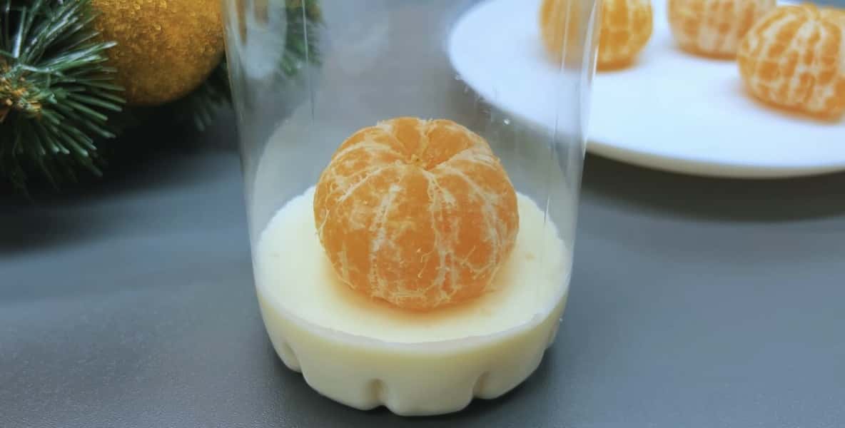 Від пляшки зрізаємо горло та виливаємо трошки підготовлену суміш. Тримаємо у холодильнику 10-15 хвилин та викладаємо мандаринку.