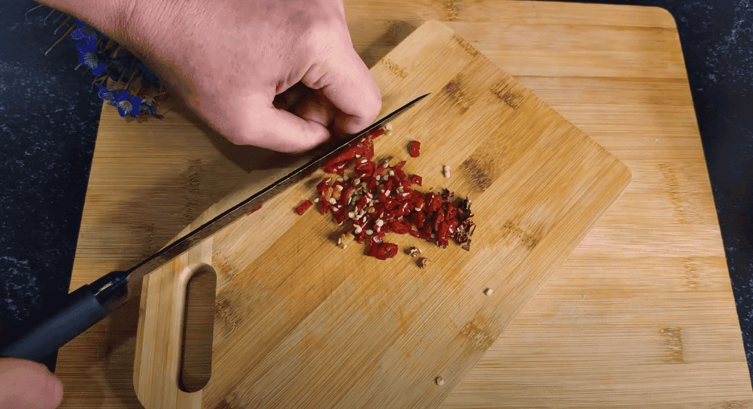 2. Гострий перець дрібно шаткуємо разом з насінням. За такої кількості салат виходить в міру гострий. Перець беріть на свій смак.